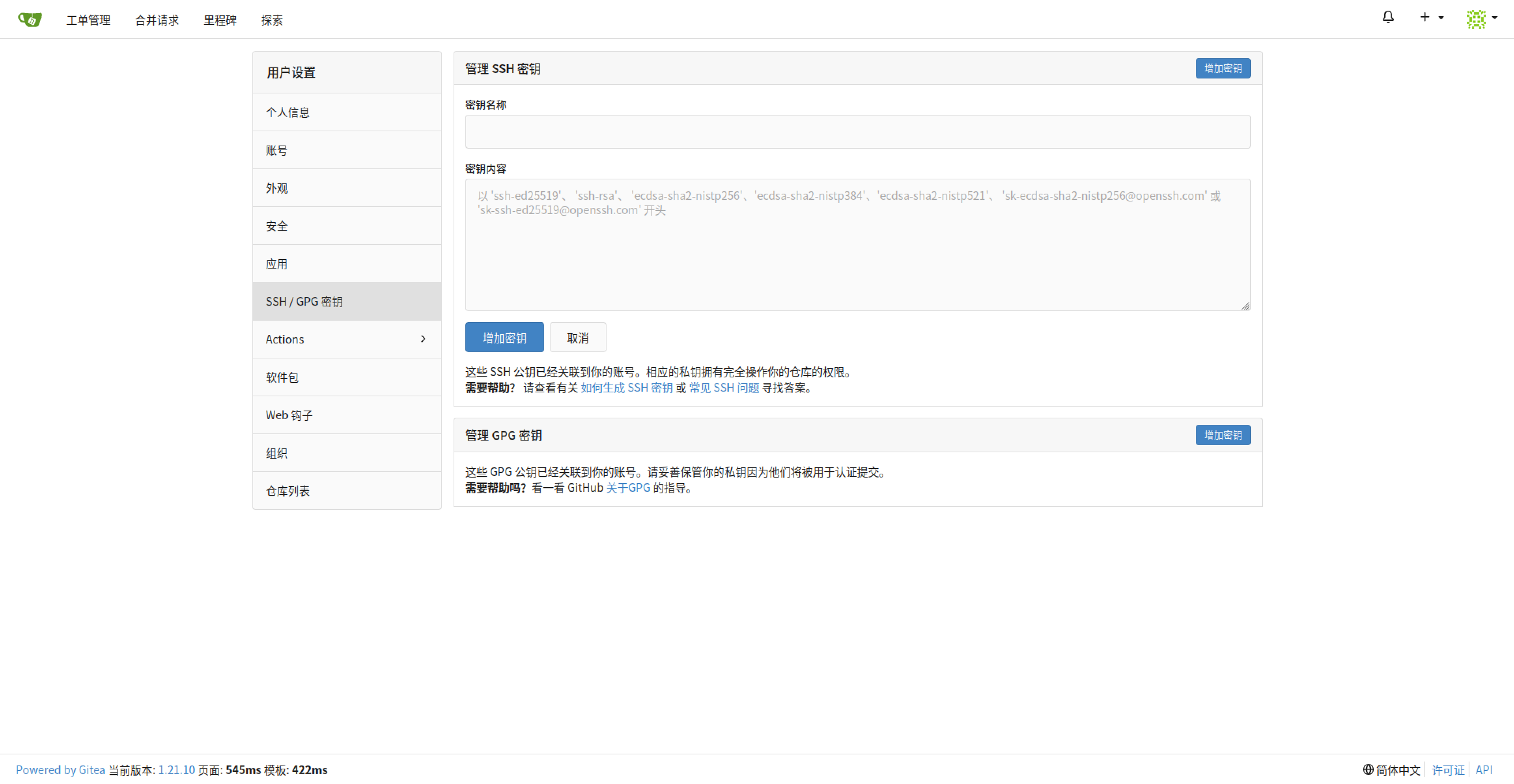 打开Gitea网页,点右上角头像,设置-SSH/GPG密钥-管理SSH密钥-增加密钥