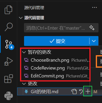 鼠标移到你想提交的文件上,右侧有个加号,点一下