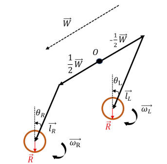 在比赛场上非常有必要分析平衡机器人的打滑状态并做出调整,否则很容易翻车倒地,下面对经典力学防打滑的分析,检测平衡两轮毂与地面接触点的速度差值,当这个差值超过某个阈值时判定为打滑,下面求该速度差值: